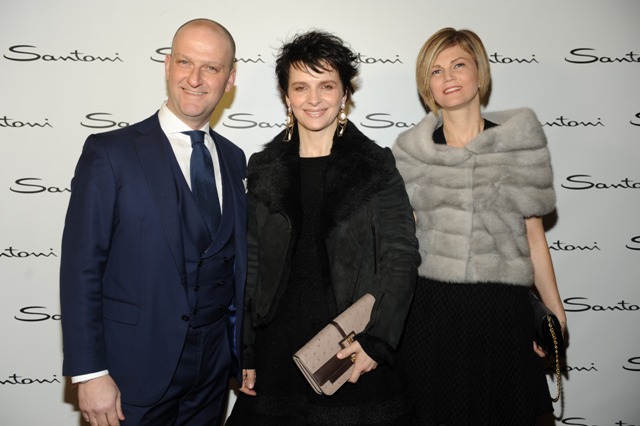 Жюльетт Бинош посетила открытие флагманского бутика бренда Santoni в Милане. Оформление бутика уникально: оно создано архитектором Патрицией Уркиолой. Иллюзия простора достигается благодаря использованию специального бронзового стекла, которое интегрировано в строгий геометрический дизайн. На фото Жюлетт с дизайнером Джузеппе Сантони и его супругой.