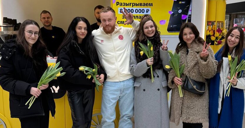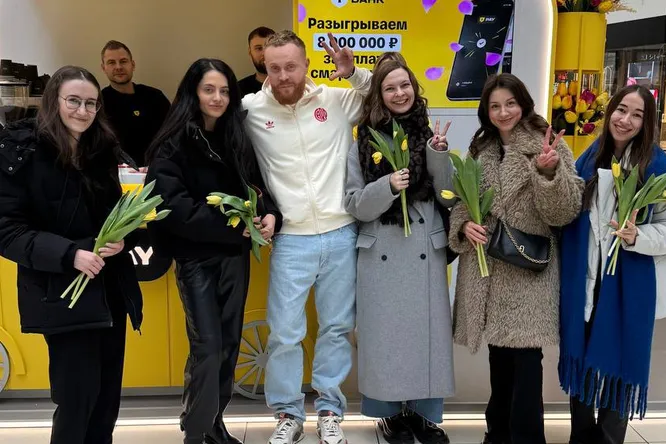 Сегодня в ТЦ «Авиапарк» посетительниц ждал необычный сюрприз. На стенде Т-Банка девушек поздравлял стендап-комик и ведущий Евгений Чебатков: он дарил желтые тюльпаны и несколько теплых слов к празднику. Цветы получали все, кто оказался рядом — вне зависимости от того, являются ли они клиентками банка.