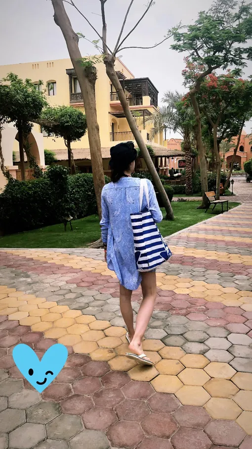 На следующем фото Загитова запечатлена со спины на территории отеля. Она идет по дорожке в платье-рубашке, шлепках, с пляжной сумкой на плече.
