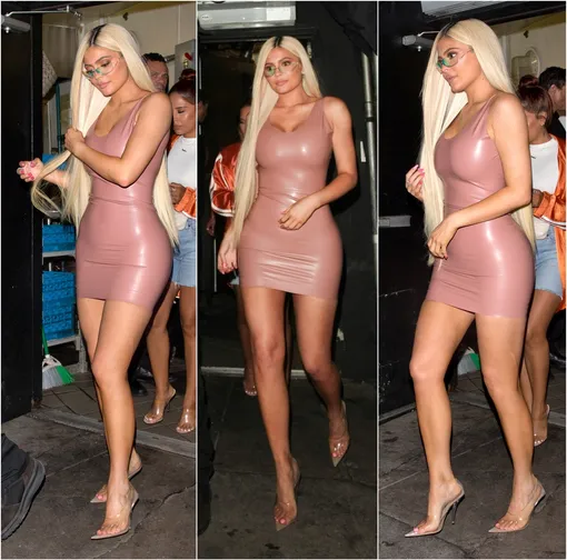 6 сентября Кайли Дженнер сходила в ресторан The Nice Guy в Западном Голливуде. Папарацци застали звезду, когда она покидала заведение. Для выхода молодая мама выбрала розовое латексное мини-платье и прозрачные туфли.