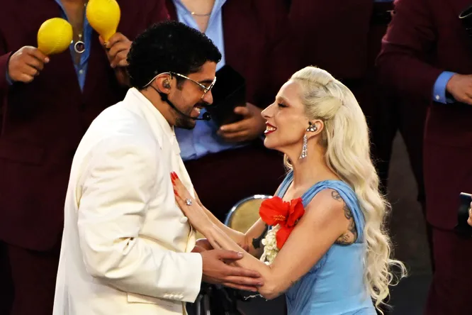 После этого к Bad Bunny на сцене присоединилась Леди Гага. 39-летняя певица и актриса надела голубое платье на тонких бретельках без рукавов и с многослойной юбкой. Ради наряда с откровенной зоной декольте обладательница «Оскара» отказалась от бюстье. Артистка исполнила песню Die With A Smile в новой аранжировке в стиле сальса. На сцену также вышел еще один пуэрториканский музыкант Рики Мартин, который исполнил хит Lo que le pasó a Hawaii.