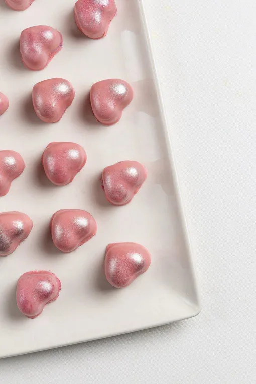 Всех гостей ждёт милый комплимент в виде розового мармеладного сердца, покрытого шоколадом.