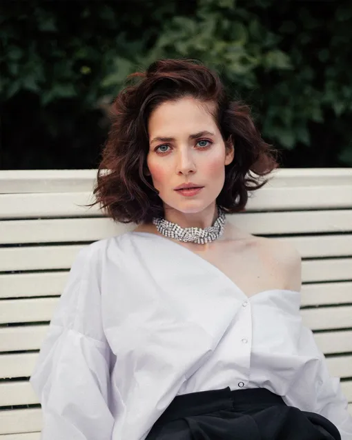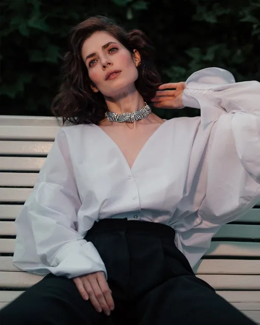 Фотосессия состоялась в сквере. Звезда фильма «Обитаемый остров» облачилась в белоснежную объемную рубашку и расстегнула верхние пуговицы, обнажив плечо. Образ дополнили тёмные брюки с завышенной талией и массивное колье.