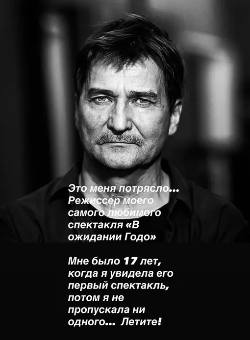 Марина Александрова опубликовала черно-белое фото Бутусова и сделала откровенное признание. «Это меня потрясло... Режиссер моего самого любимого спектакля "В ожидании Годо". Мне было 17 лет, когда я увидела его первый спектакль, потом не пропускала ни одного... Летите!» — написала звезда сериала «Макрон» в личном блоге.