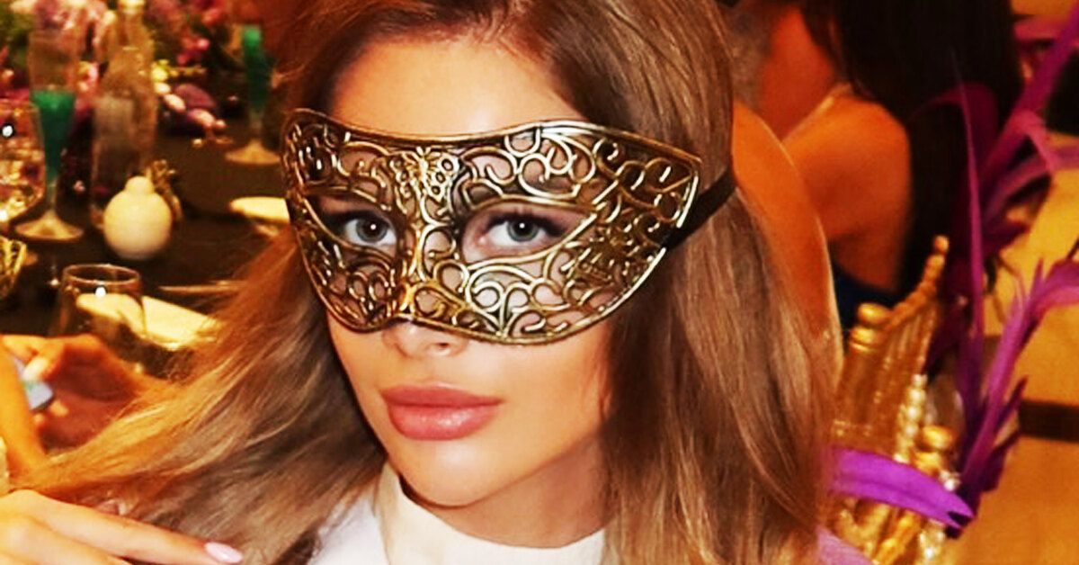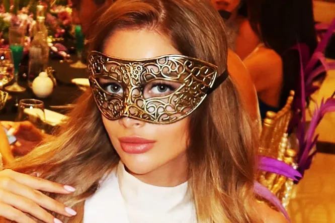 Анастасия Венза выбрала для выхода в свет мини-платье бежевого цвета с открытыми плечами и расклешенной юбкой. Образ дополнили серебристый клатч и босоножки на шпильке в тон. Из украшений девушка из Москвы надела сверкающие серьги, массивный браслет и увесистое кольцо с камнями. Модели сделали макияж с акцентом на глаза и нюдовым блеском для губ. Ее волосы уложили вьющимися локонами. Лицо звезды подиума прикрывала маска.