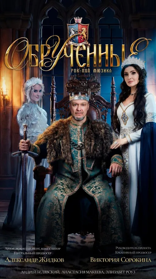 Королевская линия впечатляет масштабом и харизмой: Андрей Белявский — Короля Людвика, Ефим Архипов — скандинавского короля Роджера. Во второстепенных ролях также заняты Владислав Халько, Арнольд Петросов, Елена Денисенко и многие другие.Особое место в составе исполнителей занимает Анастасия Макеева — одна из самых ярких актрис современной театральной сцены и настоящая звезда российского мюзикла. Макеева принесла на сцену десятки ролей, став настоящим брендом качества и артистического мастерства. Её имя давно ассоциируется с крупными музыкальными постановками и культовыми персонажами: от благородной Мерседес в мюзикле «Монте-Кристо» до страстной Донны Шеридан в «Mamma Mia!», где она установила рекорд, став самой молодой артисткой в мире, сыгравшей эту роль более ста раз подряд.В мюзикле «Обручённые» Макеева предстает в роли Королевы Виктории — персонажа, придающего истории величие, эмоциональную глубину и визуальную выразительность.