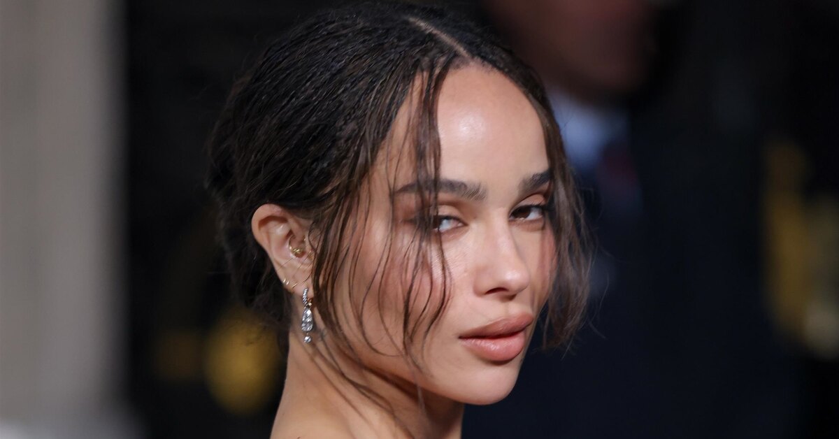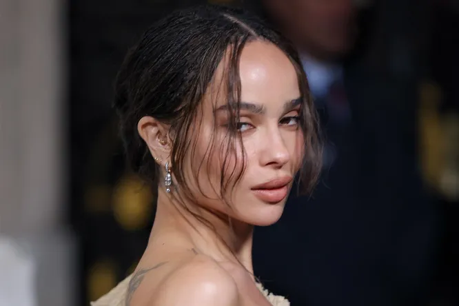 Зои Кравиц в платье-комбинации без бра засветила грудь на модном шоу в Париже