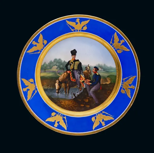 На выставке, посвященной объявленному Президентом России В.В. Путиным «Году Защитника Отечества», представлены легендарные «военные» тарелки, ставшие визитной карточкой коллекций русских монархов, а также парадные вазы и живописные пласты времен Александра I и Николая I, и другие предметы русского фарфора с батальными сценами.