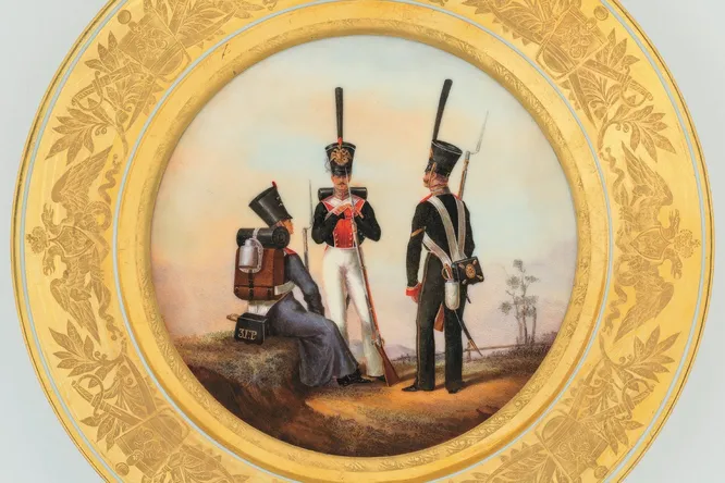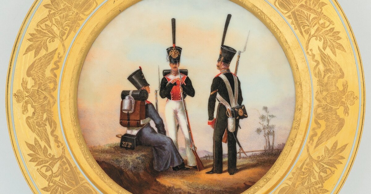 На выставке, посвященной объявленному Президентом России В.В. Путиным «Году Защитника Отечества», представлены легендарные «военные» тарелки, ставшие визитной карточкой коллекций русских монархов, а также парадные вазы и живописные пласты времен Александра I и Николая I, и другие предметы русского фарфора с батальными сценами.