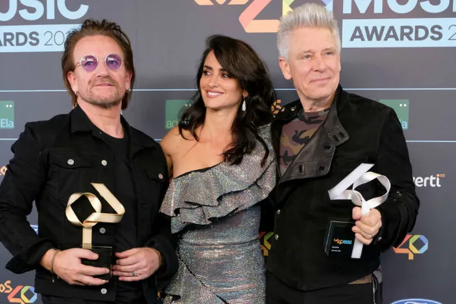 43-летняя актриса Пенелопа Крус (Penelope Cruz) блеснула на церемонии Los 40 Music Awards, прошедшей в Мадриде. Красавица-актриса не любит появляться на светских мероприятиях в одиночестве. Так и на этот раз компанию ей составили сразу два кавалера - музыканты Боно и Адам Клейтон.