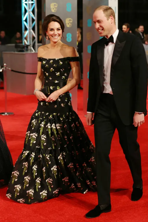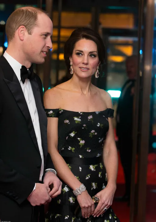 Для красной дорожки Кейт выбрала цветочное платье Alexander McQueen со спущенными плечами и фамильные драгоценности.