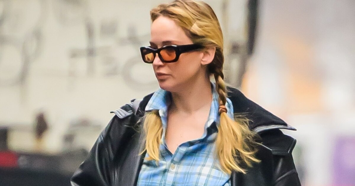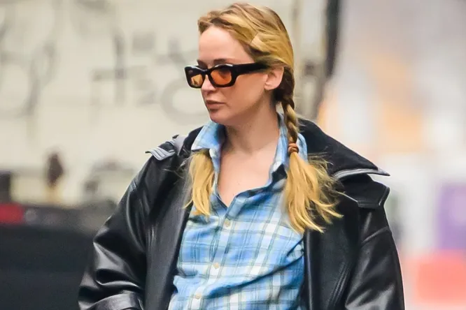Лоуренс надела безразмерную голубую рубашку в клетку и спортивные контрастные синие штаны с ярко-желтыми лампасами. Поверх звезда кино надела кожаный плащ. Завершением ее образа стали удобные кроссовки.