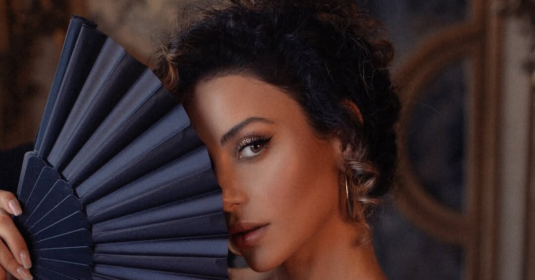 На одном из кадров она изящно прикрыла аксессуаром половину лица. На другом артистка сидела в изысканном позе на черном винтажном стуле в зале, оформленном в готическом стиле. Позади нее висела картина с историческим сюжетом.