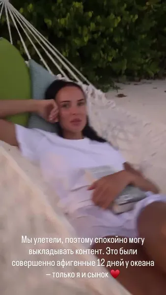 «Мы улетели, поэтому спокойно могу выкладывать контент. Это были совершенно афигенные 12 дней у океана — только я и сынок», — отметила Анастасия. Она показала трогательное видео, на котором Ратмир качал ее в гамаке на побережье.