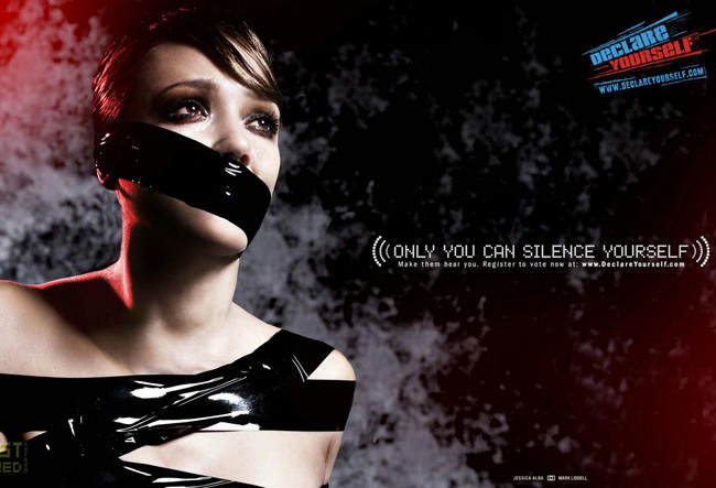 Джессика Альба занялась политикой. Молодая актриса снялась в шокирующей рекламе кампании Declare Yourself для президентских выборов в США. Реклама сделана в красно-черных тонах. Рот Джессики заклеен черной клейкой лентой, а по щекам льются слезы. «Только ты можешь заставить себя молчать",— слоган этой рекламной компании.