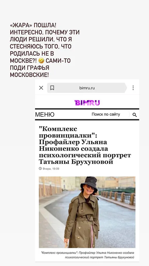 Жена артиста отреагировала на слова Никоненко о себе. «"Жара" пошла! Интересно, почему эти люди решили, что я стесняюсь того, что родилась не в Москве? Сами-то, поди, графья московские», — с иронией заявила Брухунова.