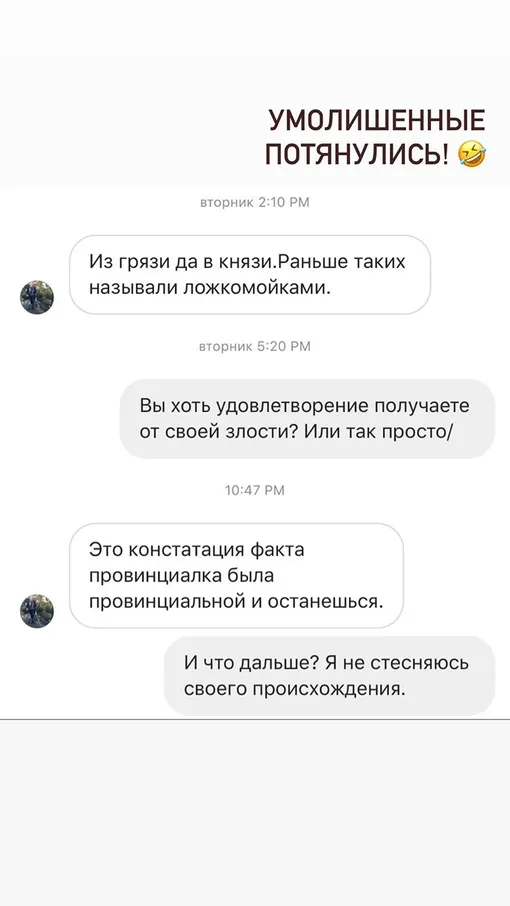 К обсуждению происхождения Татьяны подключились хейтеры. «Из грязи в князи. Раньше таких называли ложкомойками», — упрекнули Брухунову. «Вы хоть удовлетворение получаете от своей злости? Или так просто?» — ответила девушка. «Это констатация факта: провинциалка была, провинциалкой останешься», — не унимался хейтер. «И что дальше? Я не стесняюсь своего происхождения!» — заявила жена Петросяна.