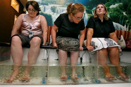 Десятки салонов красоты в крупнейшем американском мегаполисе и его окрестностях с некоторых пор предлагают своим клиентам инновационную процедуру. Вы погружаете ноги в аквариум, и стайка мелких карпов в течение короткого времени избавляет ступни от остатков омертвевшей кожи. Сообщается, что этой процедурой пользуются некоторые знаменитости из Голливуда, спортсмены и даже политики.
