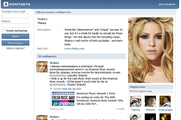 То ли Шакира решила выучить русский, то ли просто хочет разнообразить свой декретный отпуск. Так или иначе, она завела страничку в российской социальной сети Вконтакте. Адрес страницы появился в официальном Твиттере Шакиры. Правда, это больше похоже не на личный аккаунт, а на фан-группу, но поклонникам все равно приятно. На страничку подписались уже около 60 тысяч человек.