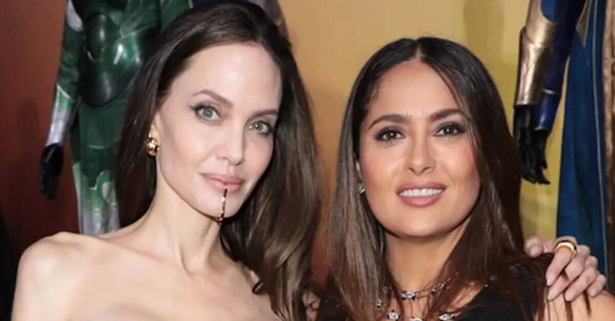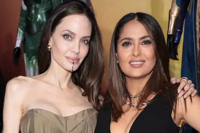Анджелина Джоли в комбинации и прозрачном платье вышла в свет с Сальмой Хайек