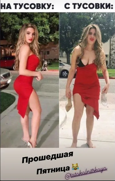 Понимая, что поклонники ждут объяснения причины ее «подвигов», Водонаева опубликовала в Instagram (Социальная сеть признана экстремистской и запрещена на территории Российской Федерации) stories забавный коллаж. Она взяла его у издателя Таты Кальницкой. «Прошедшая пятница», — красноречиво подписала автор два снимка девушек в красных платьях.
