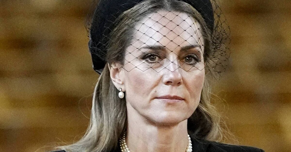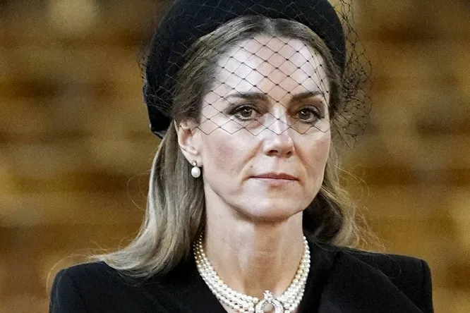 Кейт Миддлтон в шляпке с вуалью и с жемчужным колье королевы появилась на похоронах герцогини Кентской