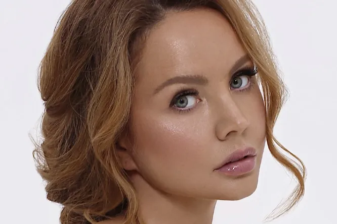 Марина выбрала для выхода в свет яркий образ. Максимова распустила и выпрямила длинные каштановые волосы, оставив пряди струиться по плечам и спине. Она нанесла выразительный макияж с акцентом на глянцевый блеск для губ.