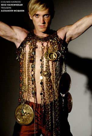 К примеру, Тима нарядили в брючки из алого шелка и весьма оригинальный предмет верхней одежды, который можно отнести и кольчуге, и к туники и даже к ювелирным украшениям. Визажисты позаботились и о причудливом «грязном» макияже актера.