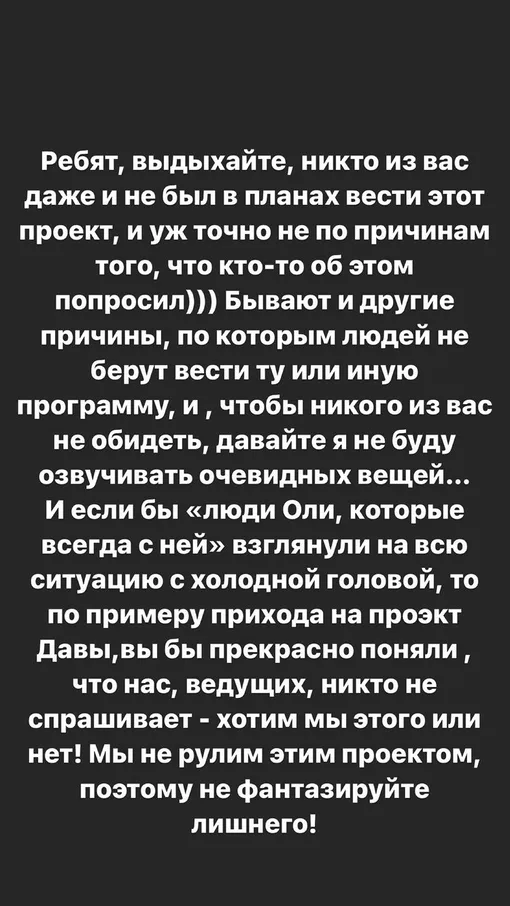 «Если бы "люди Оли, которые всегда с ней" взглянули на всю ситуацию с холодной головой, то по примеру прихода на проект Давы вы бы прекрасно поняли, что нас, ведущих, никто не спрашивает – хотим мы этого или нет. Мы не рулим этим проектом, поэтому не фантазируйте лишнего! И не ведитесь на ложь, которую преподносят вам и которая гораздо красивее той правды, что знаем мы. И поверьте, молчим об этом до сих пор», — отметила Ольга.