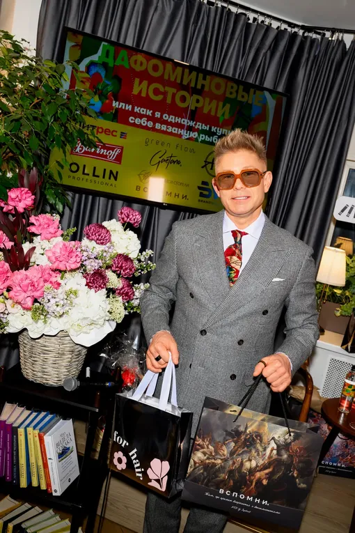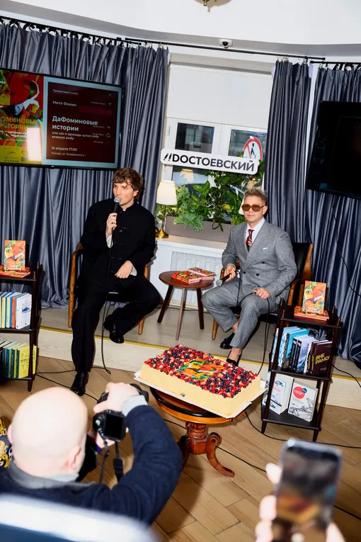 А чтобы запомнить и вспоминать этот замечательный момент, гостям подарили эксклюзивные ароматические диффузоры и саше от компании «ВСПОМНИ». Не оставила без внимания презентацию своего любимого артиста и владелица бренда «Цветочки» — Ксения Сингаевская, которая украсила обстановку узнаваемыми букетами. Стильный классический образ Мити Фомина от Cerca Trova завершили премиальные очки от бренда Kuboraum. За игристое настроение вечера отвечала компания ISSI Spirits итальянское просеко Gaetano, которое идеально сочеталось с прекрасными десертами премиум сегмента от «Особенный Наполеон». Артисту был преподнесен также фирменный торт с изображением обложки книги.