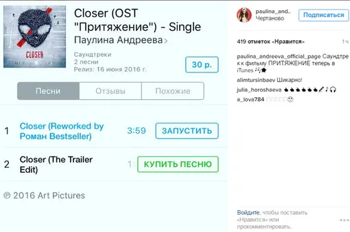 «Саундтрек к фильму "Притяжение" теперь в iTunes!» — написала Андреева под скриншотом ITunes, демонстрирующим доступный для скачивания трек с названием Closer. Поклонники звездной пары уже могут оценить его.