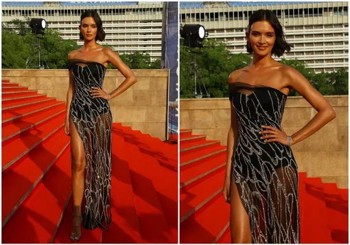 На Паулине было черное полупрозрачное платье-бюстье Maison Bohemique, украшенное пайетками. Высокий разрез выгодно подчеркнул стройные и загорелые ноги актрисы.