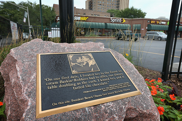 У кафе в Чикаго, где президент США Барак Обама впервые поцеловал свою будущую жену Мишель Ла Вон Робинсон, установили гранитную памятную доску.