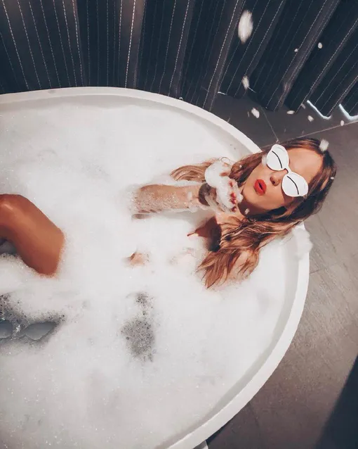На фотографии, которую певица, выступающая под псевдонимом Глюк’oZa, разместила в Instagram (Социальная сеть признана экстремистской и запрещена на территории Российской Федерации), видно, как она лежит в большой круглой ванне. На Наталье смешные белые очки с полукруглыми прорезями. Из макияжа на ней только ярко-красная помада. Девушка дует на хлопья мыльной пены.