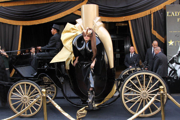А спустя пару дней после маскарада Гага устроила еще один костюмированный вечер, на который прибыла в золотой маске и «горбатом» платье в карете, запряженной настоящими лошадьми (на фото выше).