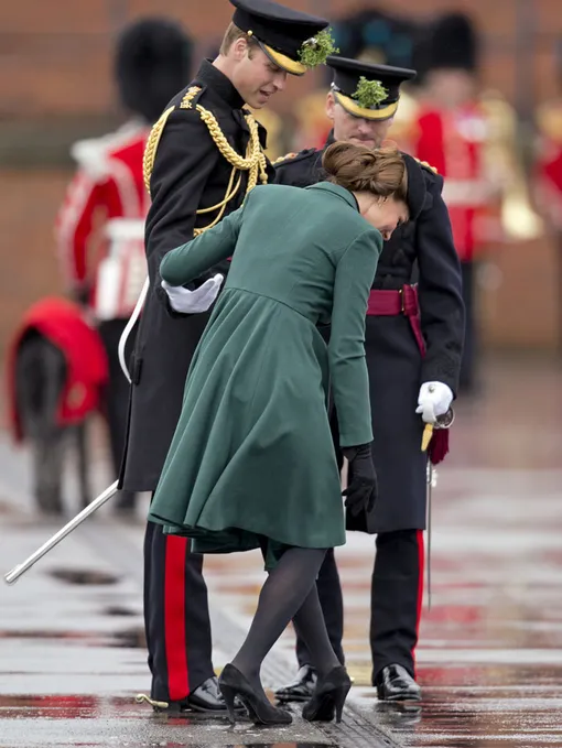 Согласно протоколу на официальные мероприятия королевская особа ходит в лодочках на каблуках. Естественно, что в такой обуви нужно быть предельно осторожной. Во время посещения наркологического центра в Эссексе с Кейт случилась истерика после того, как ее каблук зацепился за металлическую решетку. Принц Уильям заботливо поддержал под руку беременную жену, пока она вызволяла обувь.