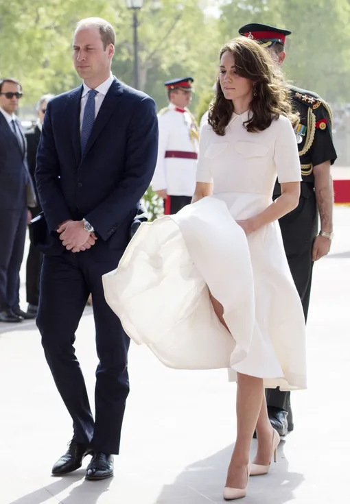 Королевские стилисты пришивают незаметные утяжелители на подолы платьев, чтобы представительницы семьи случайно не оголили ноги больше, чем положено. Однако во время визита в Индию что-то пошло не так. На церемонии возложения венков в Нью-Дели внезапный порыв ветра подхватил юбку великолепного белого платья Кейт стоимостью 2,4 тысячи фунтов стерлингов. Жена наследника престола изо всех сил старалась сохранить самообладание и взять под контроль предательский подол.