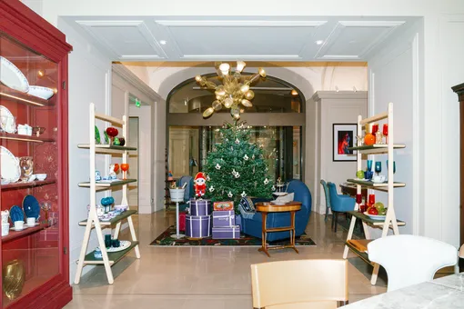 Центральным элементом оформления стала пятиметровая дизайнерская ель, украшенная игрушками ручной работы. Украшения ниспадают по спирали от маленьких шаров у вершины до крупных у основания, создавая ощущение движения и плавного перехода от света к тени, от блеска к мягкому сиянию. Свет отражается в тканевых поверхностях и ель словно становится частью дыхания пространства — живой, мерцающей, наполненной теплом праздника. Диффузоры и свечи Dr. Vranjes Firenze в зоне лобби превращают визуальный образ в полноценное сенсорное впечатление. Здесь запоминают не только картинку, но и настроение, то самое чувство праздника, которое невозможно описать, но легко почувствовать.