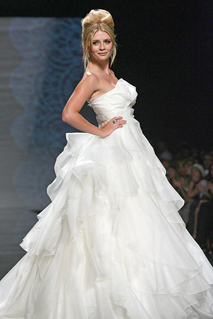 Миша Бартон приняла участие в модном показе свадебной коллекции Rosa Clara, который прошел в Барселоне. На подиум поднялась красивая стройная невеста в роскошном белом платье с открытыми плечами и модной прической «улей».