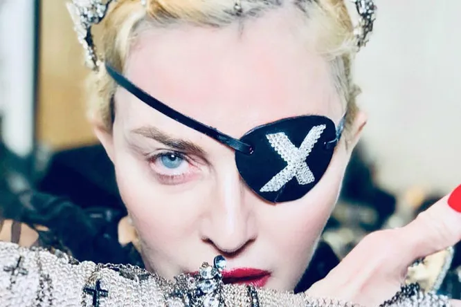 Приглашенная поп-звезда появилась перед публикой в мини-платье, которое из-за богатой отделки напомнило кольчугу. Образ дополнила повязка на глазу, которая стала главной фишкой предстоящего гастрольного тура Мадонны. Волосы звезда заплела в красивые косички.