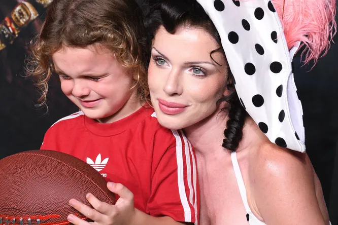 Джулия Фокс в платье в горошек с нескромным декольте появилась на премьере вместе с сыном
