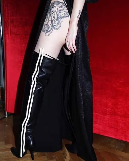 Для себя Кети выбрала небанальный монохромный наряд из спортивного бра Nike, мини-юбки с завязанной поверх клетчатой рубашкой и сапогами из новой коллекции Alexander Arutyunov.
