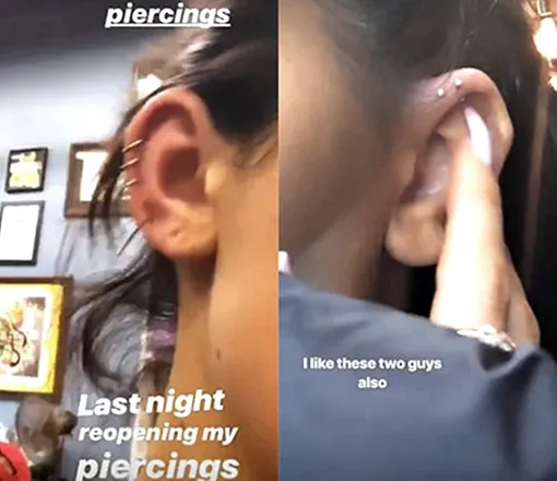 Кайли показала проколы на ушах и новые украшения. Одно ухо девушка украсила тремя серьгами-кольцами, а другое — двумя маленькими гвоздиками.
