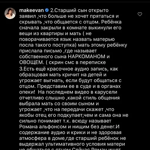 Бывшая жена Романа также обратилась лично к Макеевой. По словам многодетной матери, чем больше Макеева пишет о ней оскорбительных слов, тем глубже уходит на дно. Светлана заверила, что ради детей готова на всё.