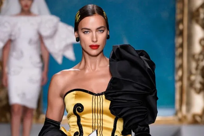 Неделя моды в Милане продолжилась для бывшей возлюбленной Брэдли Купера на подиуме Moschino. Джереми Скотт, прославившийся необычными дизайнерскими решениям, переодел Ирину под скрипку. Шейк продемонстрировала желтое боди с вышивкой и эффектным черным шлейфом. Наряд обнажил плечи и стройные ноги Ирины. В руках модель держала ноты.