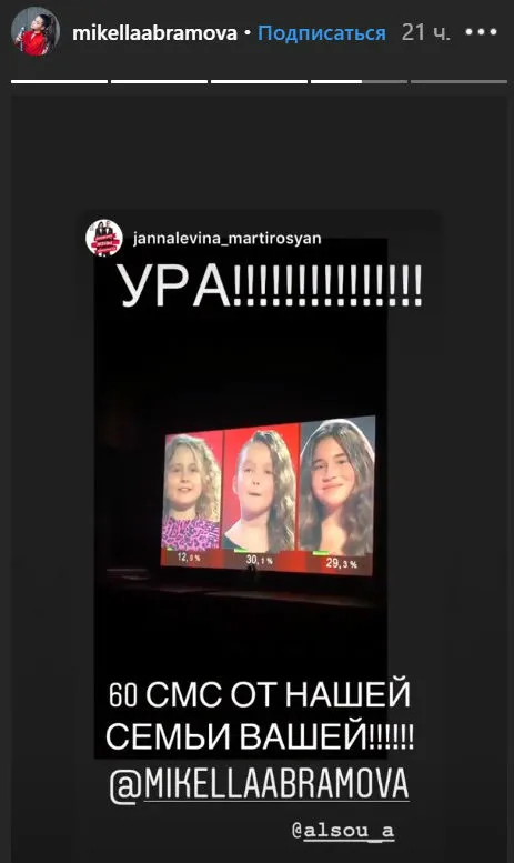 Как выяснилось, Микелле помогла подруга ее мамы, 42-летняя Жанна Левина-Мартиросян. Жена юмориста Гарика Мартиросяна написала, что ее семья отправила 60 смс-сообщений в поддержку Абрамовой. По ходу оглашения результатов голосования в прямом эфире дочь Алсу долгое время шла на втором месте, и лишь на последних секундах смогла победить.