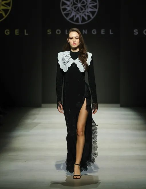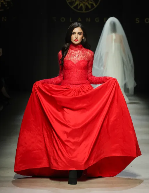 Новая коллекция Solangel — это уже про роскошь вечерних платьев и костюмов. Меня поразило то, насколько скрупулезная работа была проведена над каждым образом: сверкающие кристаллы, многослойность, кружевные вставки и аксессуары, отсылающие к традиционным русским мотивам. Мимо кроваво-красного платья, в котором я дефилировала, попросту невозможно пройти мимо — обязательно бросишь взгляд и восхитишься его женственностью.