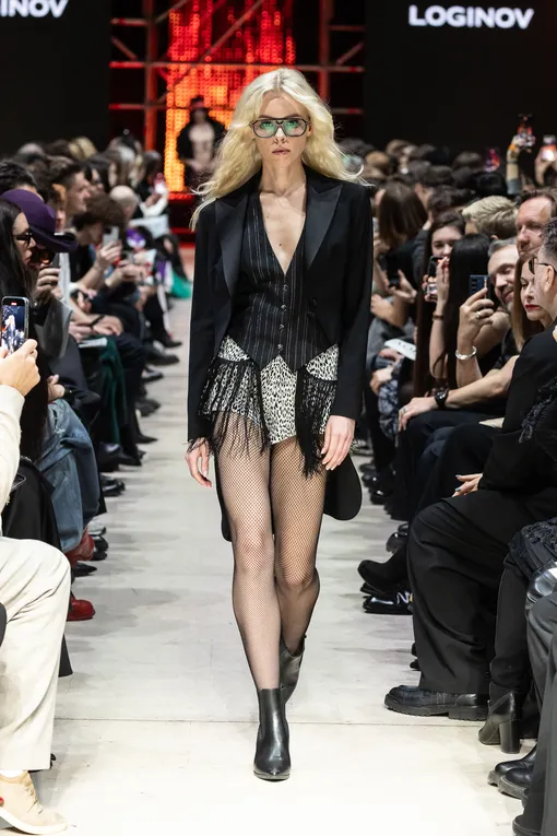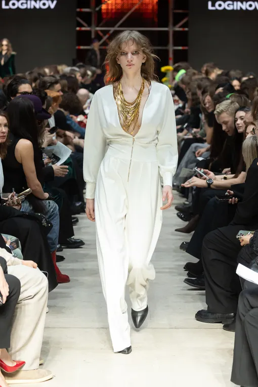 Коллекция бренда Loginov впечатлила меня не меньше. Здесь тоже много экспериментов с оттенками, кроем, фактурой, но есть и вполне определенная тематика, которая тянулась общей нитью через все изделия. Дизайнеры явно вдохновлялись рок-н-ролльной эпохой семидесятых, когда свобода самовыражения вышла на пик своего развития вместе с музыкой. Очень понравилось внимание к аксессуарам: шляпы, темные очки, подвески, платки — все смотрелось органично и в стиле эпохи.
