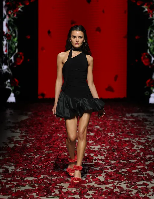 Подиум, украшенный лепестками роз, и такие же чувственные образы — это выбор дизайнеров, хорошо отражающий философию бренда Li Lab. Элегантные, смелые и даже неоднозначные изделия, которые отчетливо подчеркивают красоту женской фигуры – фишка коллекции. Я дефилировала в черном платье мини, подол которого напоминает цветочные лепестки, а также в красных туфлях, которые сливавшихся с подиумом. Отмечу высокое качество тканей, их невесомость в сочетании с приталенными силуэтами.
