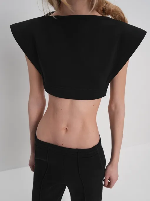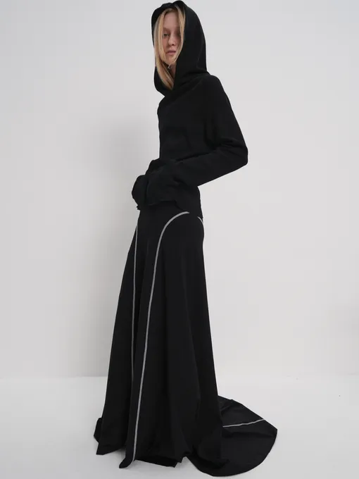 Ключевое внимание в коллекции уделено крою: длинные рукава, брюки, перетекающие в пол, и подолы-лужи сочетаются с лаконичными предметами гардероба. Среди знаковых вещей — цельнокроеные водолазки без единого горизонтального шва и лонгсливы из плотного бифлекса с бандажным эффектом. В последних пристального внимания заслуживают декоративные плоские швы, которые анатомически подчёркивают линии тела.